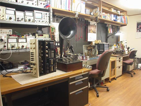 作業台と測定調整卓が並び、細かい作業から大きな作業まで対応できます。